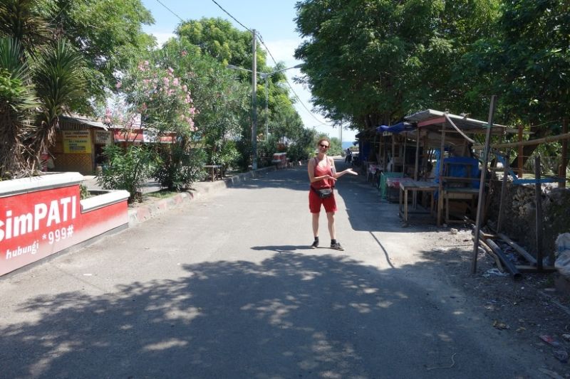 Na een rustige rit (… ja het kan dus ook rustig..), komen we net na de middag aan in Pantai Bira. Een soort badplaats, zeg Renesse, voor de locals en bewoners van Makassar…Kan heel druk zijn..vol met dagjesmensen. Vooral op zondag… Het is vandaag zondag!! Dus als de chauffeur stopt en wij niets anders zien dan welgeteld 1 geit en een kat met halve staart midden op de weg, vraag ik me af of we wel goed zitten. De plaats is uitgestorven, geen geluid, geen mensen, de stalletjes langs de weg zijn leeg en verlaten..